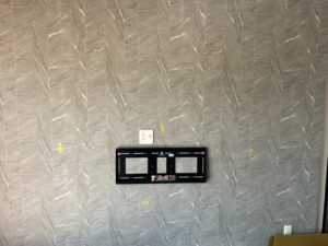 施工前は、テレビ設置予定箇所がふかし壁として仕上がっている状態でした。施工前の写真1枚目では、下地がしっかり確保されたふかし壁の様子をご確認いただけます。続く写真2枚目では、HAMILeX(ハミレックス)製の壁掛け金具を、水平・強度を確認しながら丁寧に取り付けた状態を掲載しています。